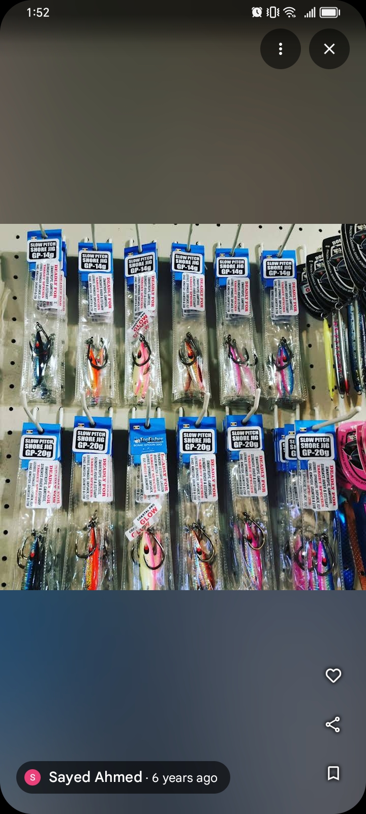 Shore jigs, fresh frozen bait, polarized sunglasses, line, tackle boxes — everything for a day on the water.